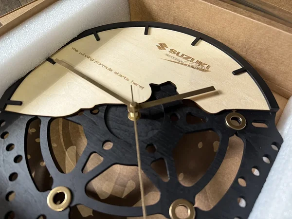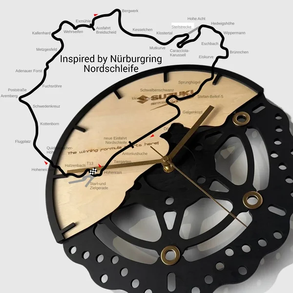 Mustkunstiteatri Efektilaboris valminud eksklusiivne puidust seinakell, mille ainulaadne disain on inspireeritud mootorispordi ajaloost ja võidusõidust. Kellalt leiame vihje ka legendaarse Nürburgring Nordschleife põhjapoolse sektori kontuurile. Saadaval ainult Suzuki Team Estonia poest!
